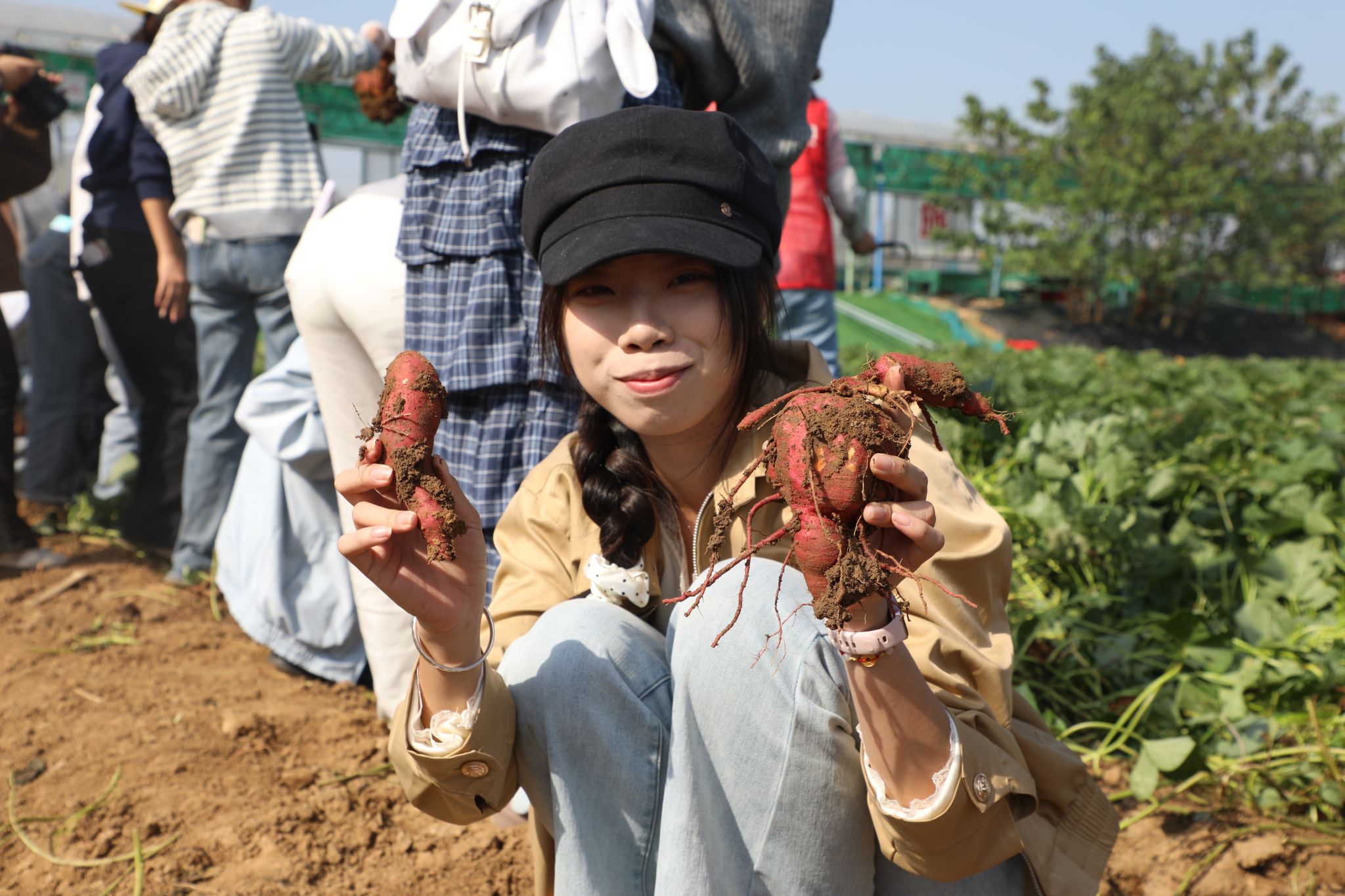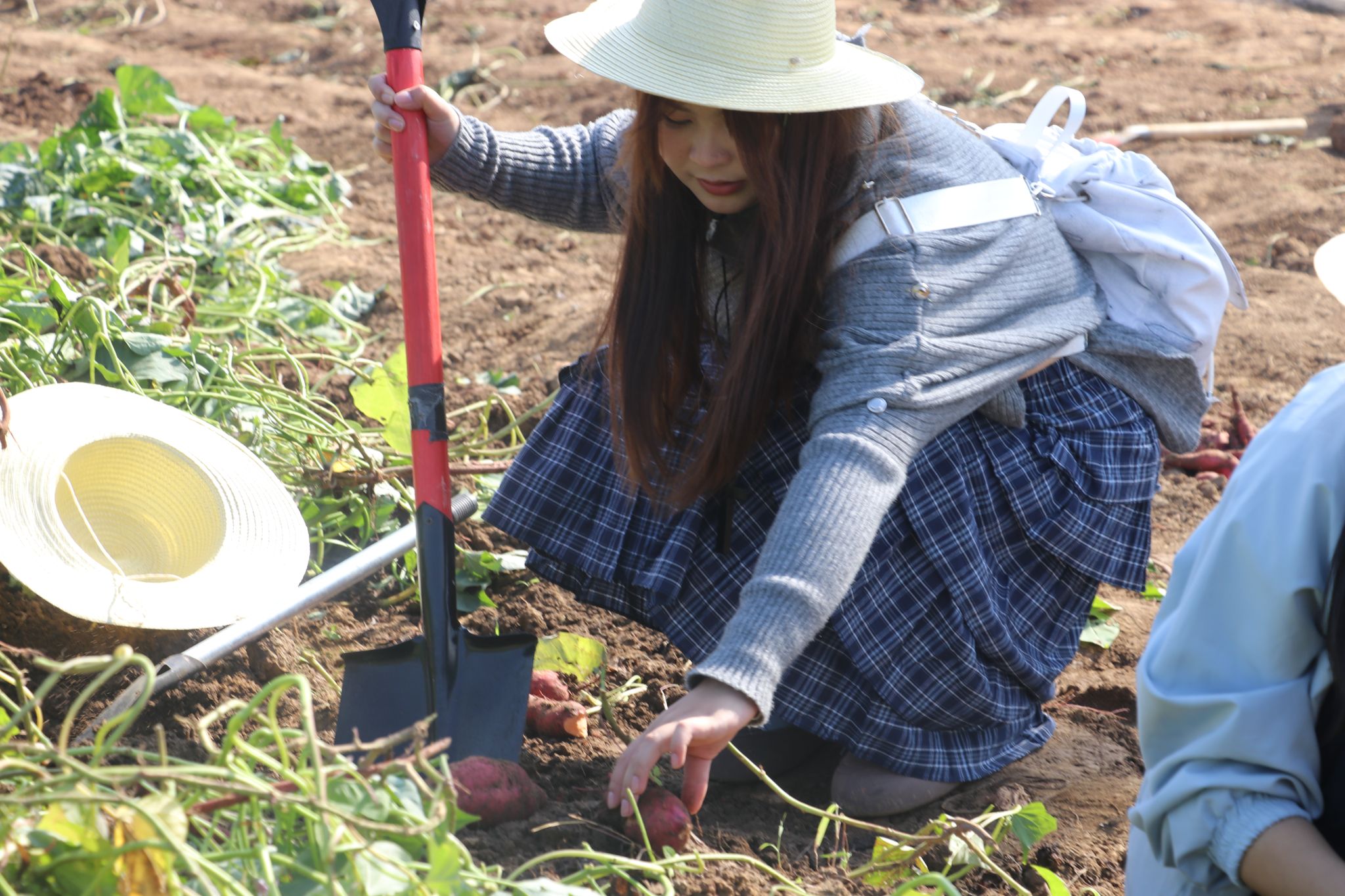 上午的行程在江南田园生态农场展开。田园老师以“红薯是根还是茎”这一有趣的问题开场,引发了同学们的浓厚兴趣。原来,红薯虽长在土里,却属于“块茎”,是植物的茎部变态发育而成。同学们一边聆听讲解,一边亲手触摸泥土,了解红薯的种植周期、生长环境与采收技巧。